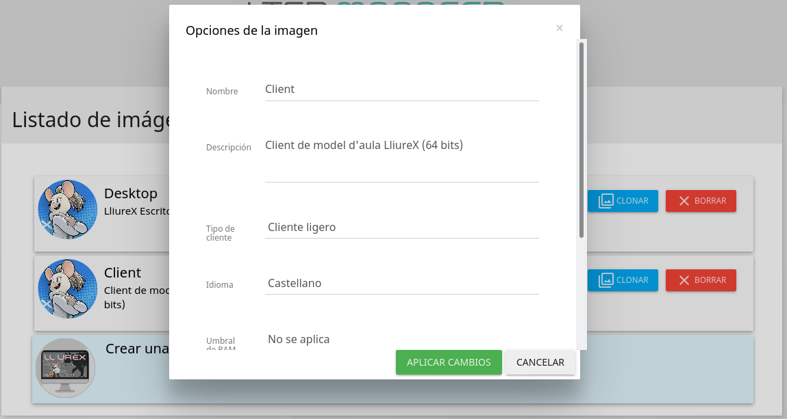 | Tipo de cliente | Aquí podemos forzar si queremos que la imagen arranque con cliente ligero o semiligero. |