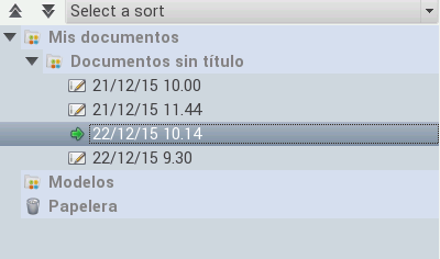 Open Sankoré crea automáticamente un nuevo documento cuando se inicia el programa, el cual es almacenado en la carpeta "Documentos sin título", incluyendo la fecha y hora de creación. El documento activo tiene una flecha verde señalizándolo.