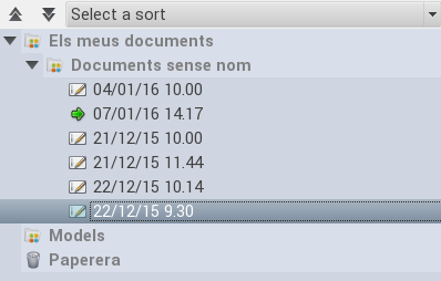 L'Open Sankoré crea automàticament un document nou quan s'inicia el programa, i l'emmagatzema en la carpeta "Documents sense nom", incloent-hi la data i hora de creació. El document actiu té una fletxa verda per a senyalar-lo.