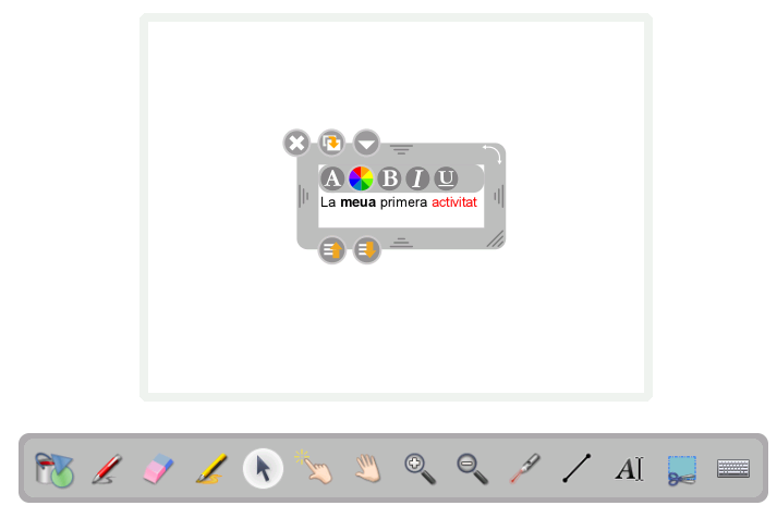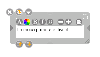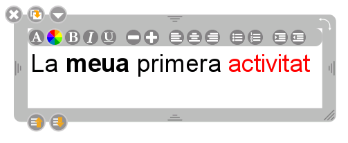 Però aquest text és massa xicotet per a representar un títol, per la qual cosa hem d'augmentar-ne la mida mitjançant la selecció del text i la pulsació del botó +. Amb cada clic augmenta un punt la mida del text. Una vegada hem fixat la mida desitjada, podem canviar-ne el color i la tipografia polsant els dos primers botons. En l'exemple s'ha fixat el color roig per a la paraula 'activitat' i s'ha posat la paraula 'meua' en negreta.