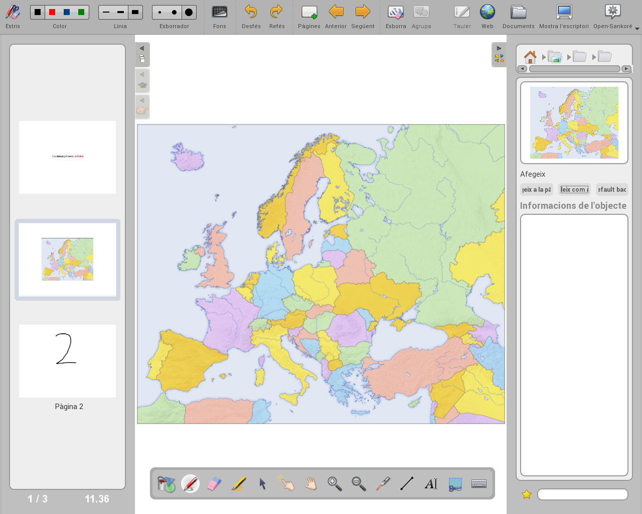 A continuació polsem sobre l'única diapositiva que hi ha en blanc i podrem treballar-hi. En aquesta diapositiva incrustarem una imatge com a fons de pantalla; per a fer-ho cal accedir al menú de recursos de la subfinestra biblioteca, a la dreta de la pantalla. En aquest cas busquem un mapa d'Europa mitjançant la selecció de la carpeta Imatges ->Cartes ->Europe. Hi ha dos mapes, seleccionem el mapa polític. En fer-hi clic damunt apareix la imatge i tres botons, dels quals hem de polsar el segon Afig com a fons.