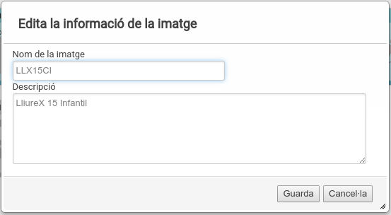 La segona icona, el bloc, permet editar les propietats de la imatge, com ara el nom i la descripció. Si posem damunt, es mostra un diàleg en el qual podrem modificar les dades i, en acabar, polsar el botó Guarda.