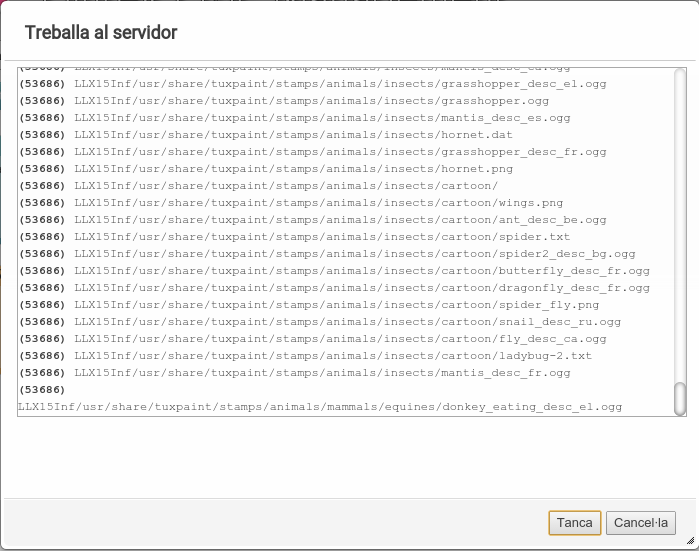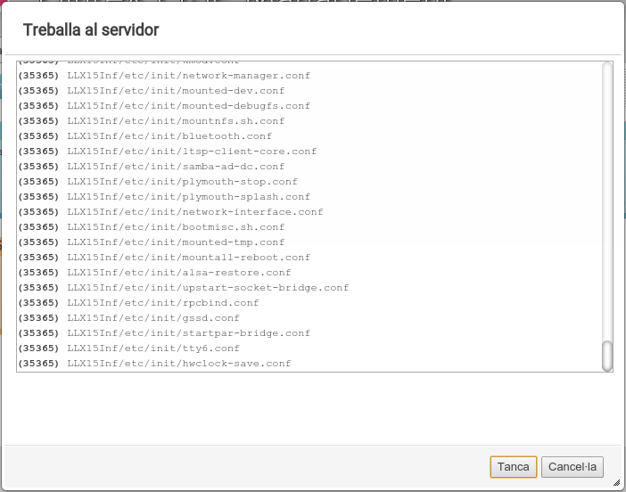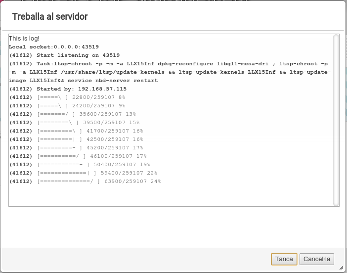 Una vegada realitzada l'edició i els canvis que desitgem, tanquem la finestra i se'ns indica que hem de regenerar la imatge que s'envia als clients. Això és perquè, fins al moment, hem modificat la instal·lació del sistema en la carpeta chroot local, però no la imatge que utilitzen els clients, que es troba comprimida i preparada per a funcionar per LTSP, de manera que cal tornar a generar esta imatge. Aquesta regeneració pot fer-se ara o més avant, i la imatge queda marcada com que ha sigut modificada i necessita actualització.