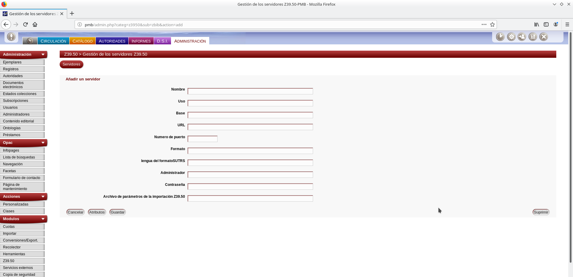 PMB permite dar de alta nuevos servidores z39.50 o bien actualizar o modificar la información de los servicios ya existentes.