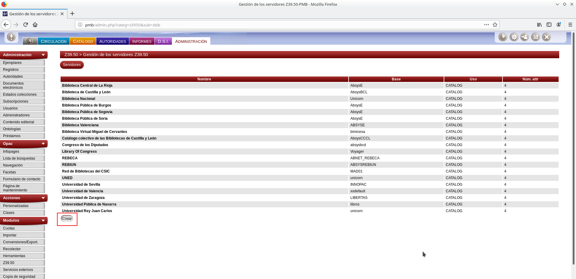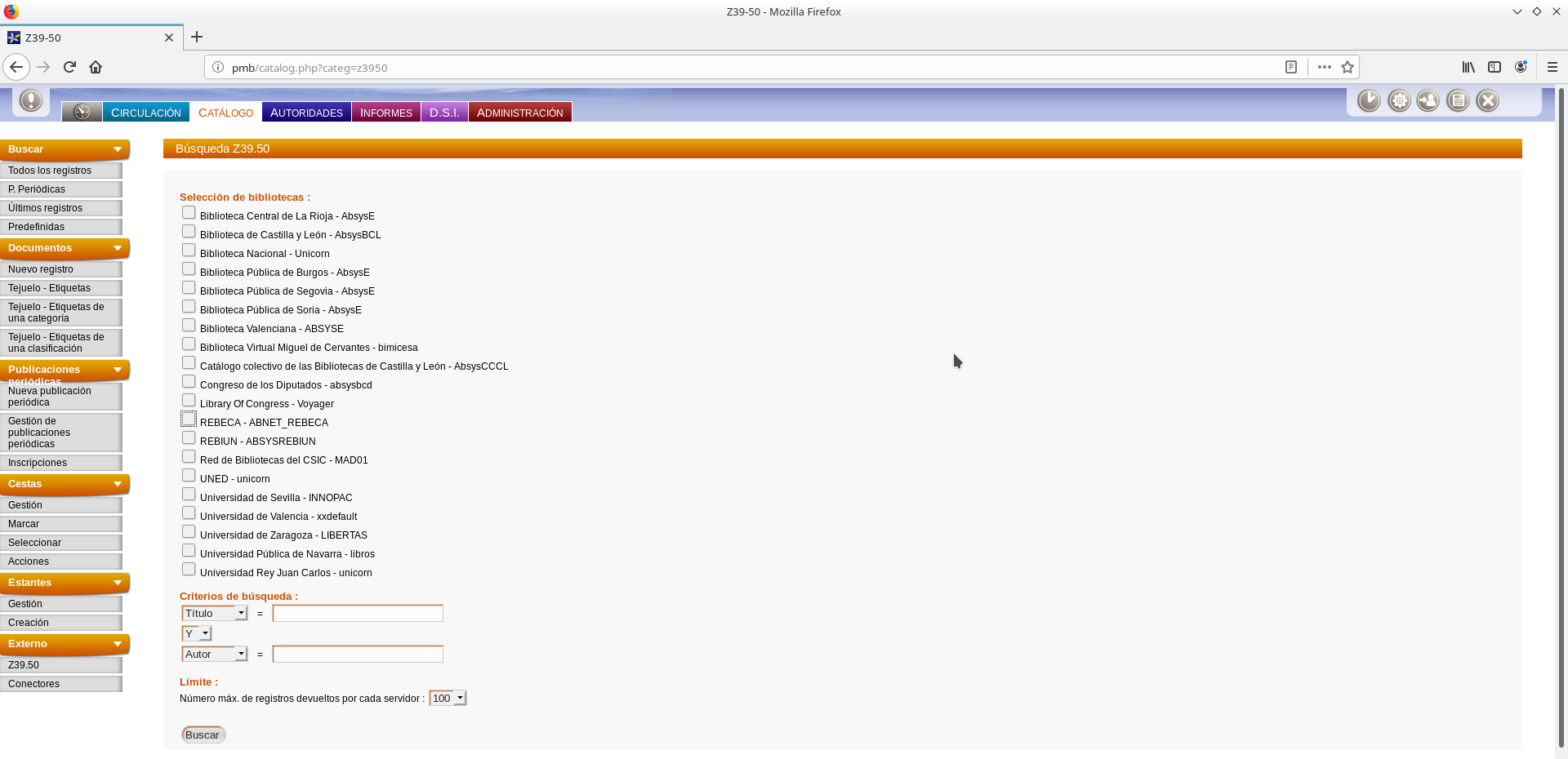 Se mostrará la relación de bibliotecas o catálogos que pueden consultarse mediante z39.50 que actualmente definidos en el PMB.