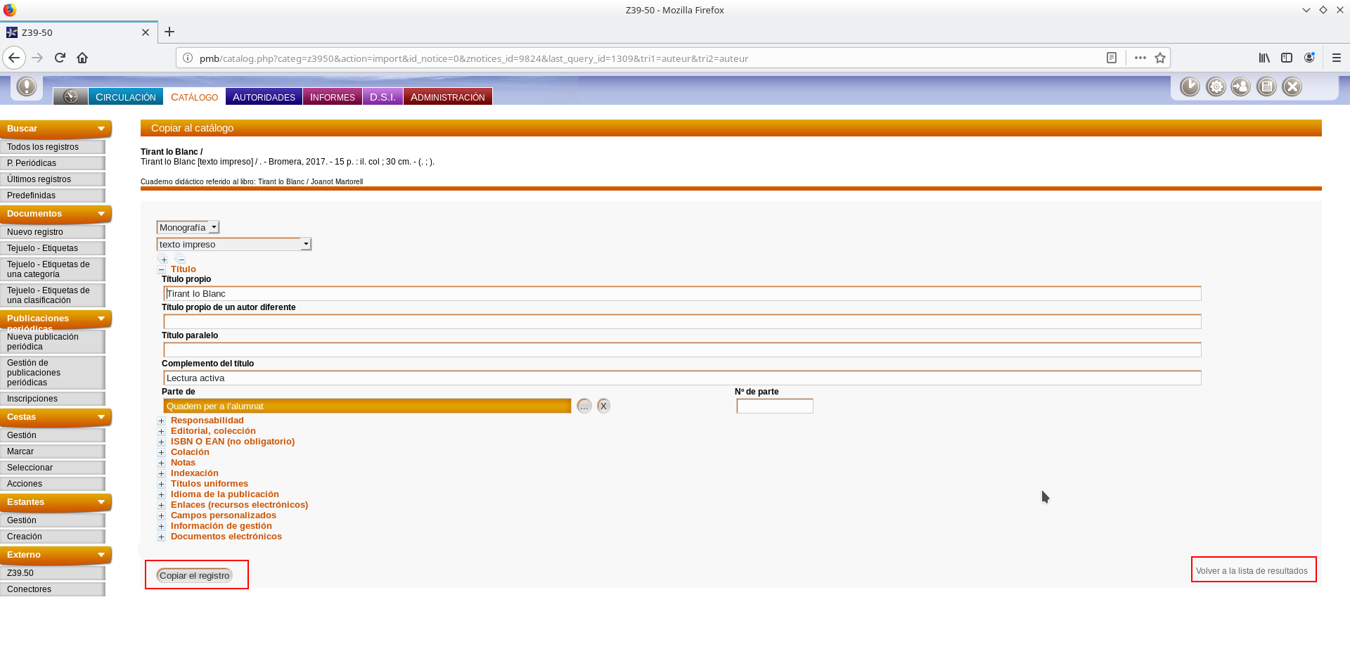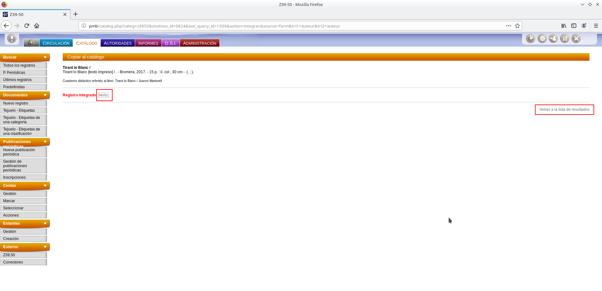 La lista de resultados se presenta los registros resumidos en formato ISBD. Para seleccionar un registro se debe pulsar sobre su título, mostrándose la información del registro que puede modificarse y completarse antes de decidir si se incorpora al catálogo del PMB.