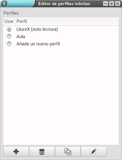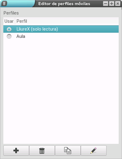 Esta opción es muy interesante ya que permite el duplicado de un perfil, lo que nos ofrece la posibilidad de basarnos en uno ya configurado. Para ello debemos, en primer lugar, seleccionar el perfil que queremos duplicar y, una vez hecho, pulsar el botón de duplicado (el que tiene dos páginas). En ese momento, se crea un nuevo perfil como copia del que hemos seleccionado (en el ejemplo hemos duplicado el perfil LliureX).