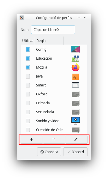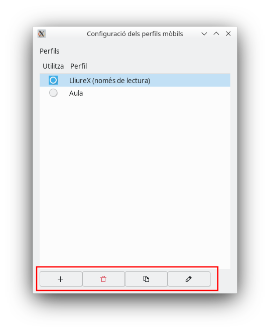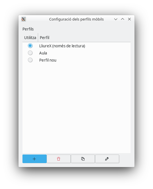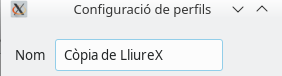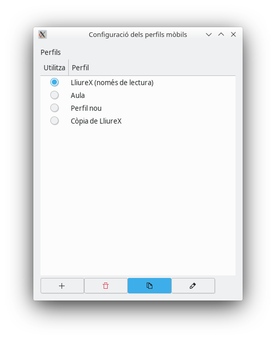 Aquesta opció és molt interessant ja que permet el duplicat d'un perfil, la qual cosa ens ofereix la possibilitat de basar-nos en un perfil ja configurat. Per a això, en primer lloc, hem de seleccionar el perfil que volem duplicar i, una vegada fet, polsar el botó de duplicat (el que té dos pàgines). En aqueix moment, es crea un perfil nou com a còpia del que hem seleccionat (en l'exemple hem duplicat el perfil LliureX).