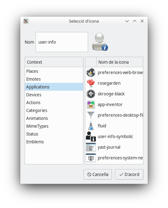 Si polsem l'últim botó (el del llapis), s'obri una finestra nova amb el nom, la icona i els patrons existents per a la regla. El nom es pot modificar mitjançant la introducció del nou, en la part superior. Així mateix, la icona es pot canviar si polsem sobre l'actual, la qual cosa fa que es mostre una finestra amb les icones disponibles, de les quals hem de triar-ne una i polsar el botó D'acord.