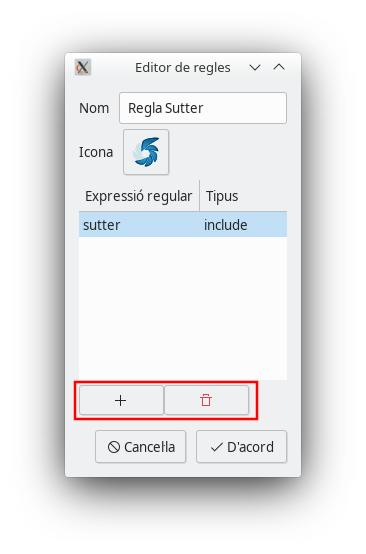 En la part inferior de la finestra, es mostren tres botons que permeten realitzar altres tres operacions: afegir una regla, esborrar-la i modificar-la, respectivament.