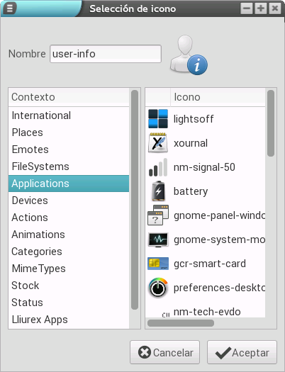 Si pulsamos el último botón (el del lápiz), se abre una nueva ventana con el nombre, icono y patrones existentes para la regla. El nombre puede ser modificado mediante la introducción del nuevo, en la parte superior. Asimismo, el icono puede ser cambiado si pulsamos sobre el actual, lo que hace que se muestre una ventana con los disponibles donde debemos elegir uno y pulsar el botón Aceptar.