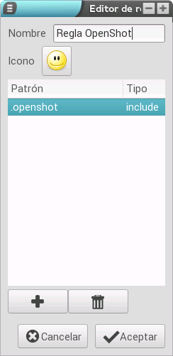 El siguiente paso es editar los patrones, para lo cual debemos pulsar sobre cada línea de la lista y escribir lo que necesitemos. También podemos utilizar los botones de la parte inferior (el + y el cubo de basura), para añadir nuevos patrones y eliminar los existentes. En el ejemplo se ha creado una regla para el Openshot:
