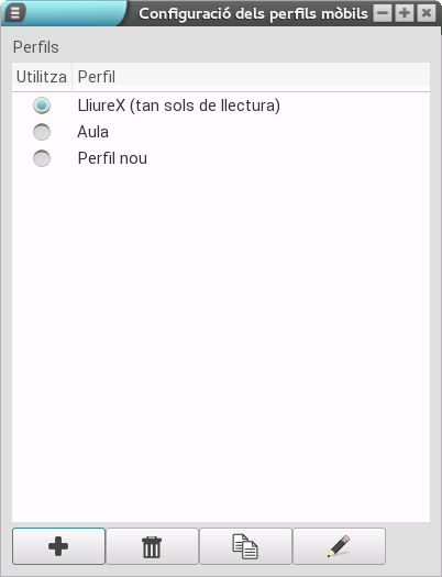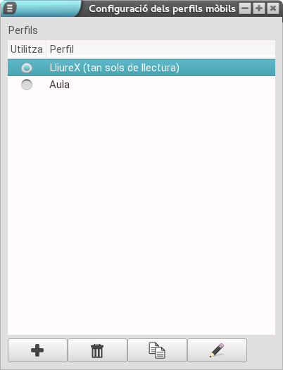 Aquesta opció és molt interessant ja que permet el duplicat d'un perfil, la qual cosa ens ofereix la possibilitat de basar-nos en un ja configurat. Per a això, en primer lloc, hem de seleccionar el perfil que volem duplicar i, una vegada fet, polsar el botó de duplicat (el que té dos pàgines). En aqueix moment, es crea un perfil nou com a còpia del que hem seleccionat (en l'exemple hem duplicat el perfil LliureX).