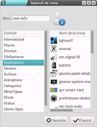 Si polsem l'últim botó (el del llapis), s'obri una finestra nova amb el nom, la icona i els patrons existents per a la regla. El nom es pot modificar mitjançant la introducció del nou, en la part superior. Així mateix, la icona es pot canviar si polsem sobre l'actual, la qual cosa fa que es mostre una finestra amb les icones disponibles, de les quals hem de triar-ne una i polsar el botó D'acord.