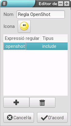 El pas següent és editar-ne els patrons, per a això hem de polsar sobre cada línia de la llista i escriure el que necessitem. També podem utilitzar els botons de la part inferior (el + i la paperera) per a afegir-hi patrons nous i eliminar-ne els existents. En l'exemple s'ha creat una regla per a l'Openshot.
