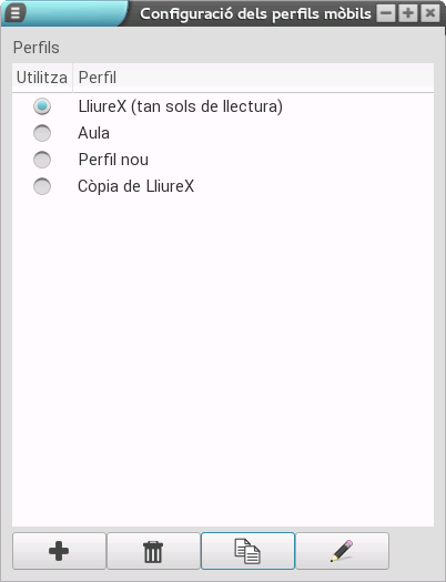 Aquesta opció és molt interessant ja que permet el duplicat d'un perfil, laqual cosa ens ofereix la possibilitat de basar-nos en un ja configurat. Per a això devem, en primer lloc, seleccionar el perfil que volem duplicar i, una vegada fet, polsar el botó de duplicat (el que té dues pàgines). En aqueix moment, es crega un nou perfil com a còpia de què hem seleccionat (en l'exemple hem duplicat el perfil LliureX).