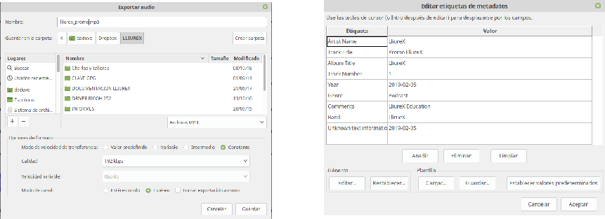 - Per a acabar, exportarem l'àudio, seleccionant el seu format i emplenant una taula de valors, són les metadades que portarà el nostre podcast.
