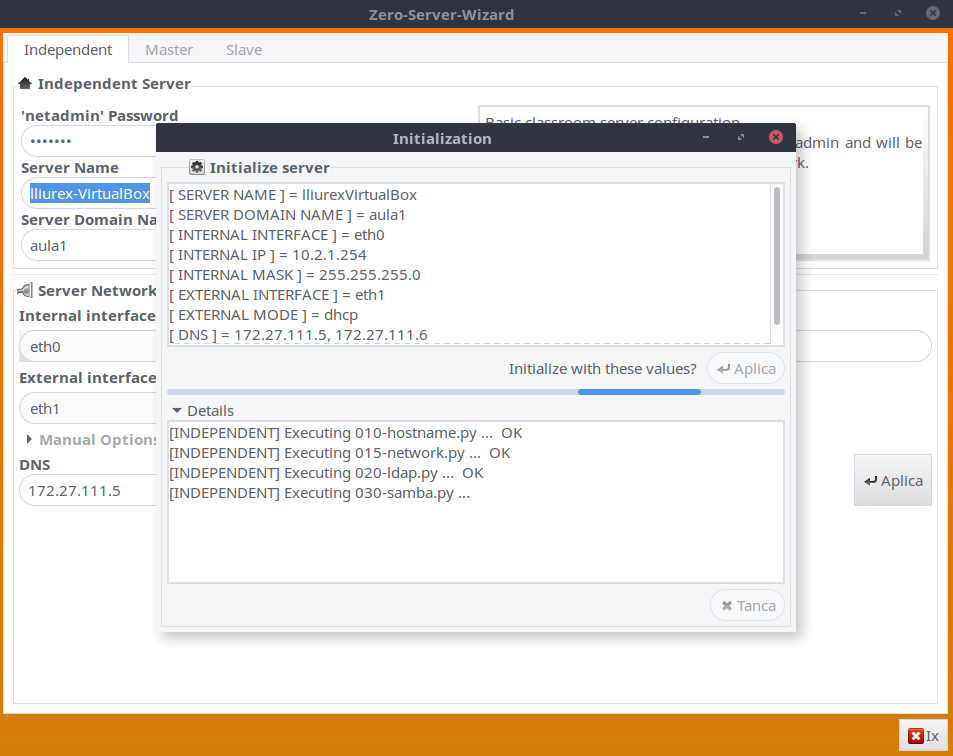Una vez rellenados todos los campos pulsaremos sobre el botón Aplica y se abrirá una nueva ventana donde podremos ver el proceso de inicialización: