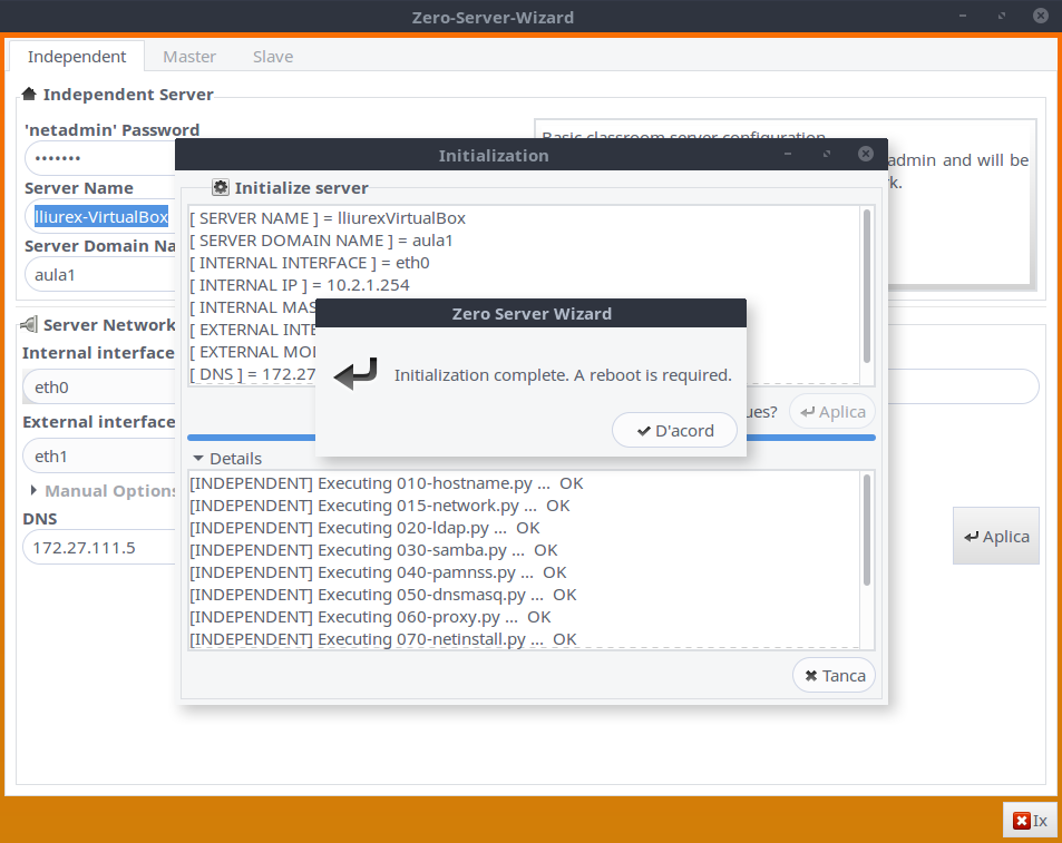 Cuando termine el proceso nos saldrá una ventana que nos confirmará que el proceso ha finalizado y que debemos reiniciar el servidor: