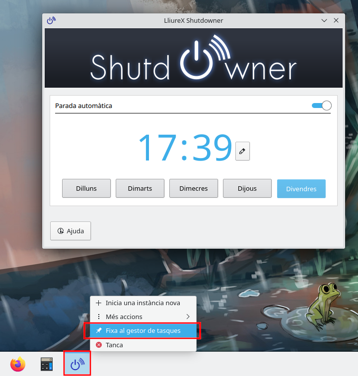 També és possible afegir una aplicació que s'estiga executant si es fa clic amb el botó dret del ratolí sobre la seua icona i es tria l'opció Fixa al gestor de tasques.