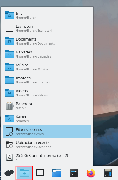 En aquesta zona es mostren els accessos directes als directoris més habituals tals com la carpeta personal, l'escriptori, descàrregues...