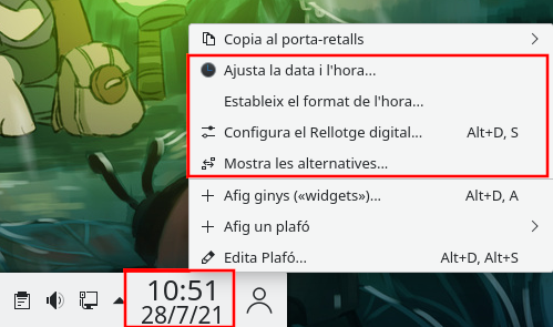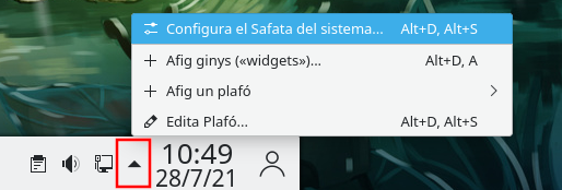 La safata del sistema es pot personalitzar si fem clic amb el botó dret del ratolí sobre la seua icona i seleccionem l'opció Configura la safata del sistema.