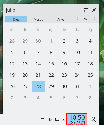 La zona del calendari mostra per defecte l'hora del sistema. Si fem clic sobre l'hora es mostra un calendari complet.