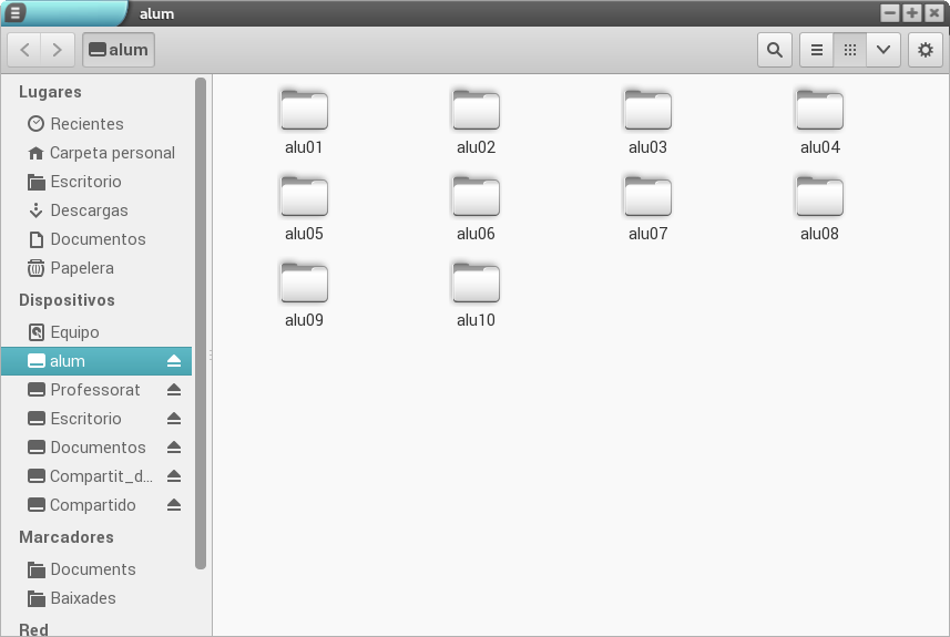 Al abrir la Carpeta personal como profesor, existirá una carpeta llamada alum que contiene acceso a todo el alumnado del sistema, es decir, tanto usuarios de ITACA/Gescen como usuarios genéricos generados desde el LLUM.