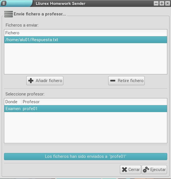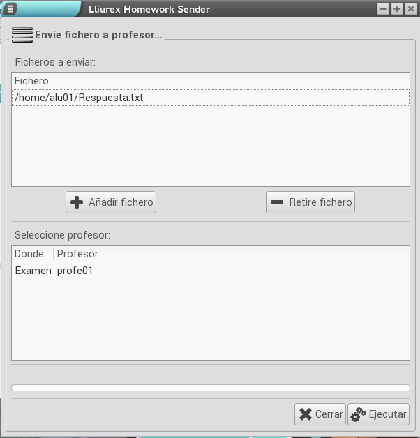 A continuación, aparece una ventana en la que se pueden añadir más ficheros, si el alumnado lo desea, utilizando los botone Añadir fichero y Retire fichero. Una vez tenga todos los ficheros listos, el alumno o alumna tiene que seleccionar en el listado de la parte inferior del programa la carpeta a la que quiere enviar el trabajo. Una vez seleccionada, sólo queda hacer clic en Ejecutar.