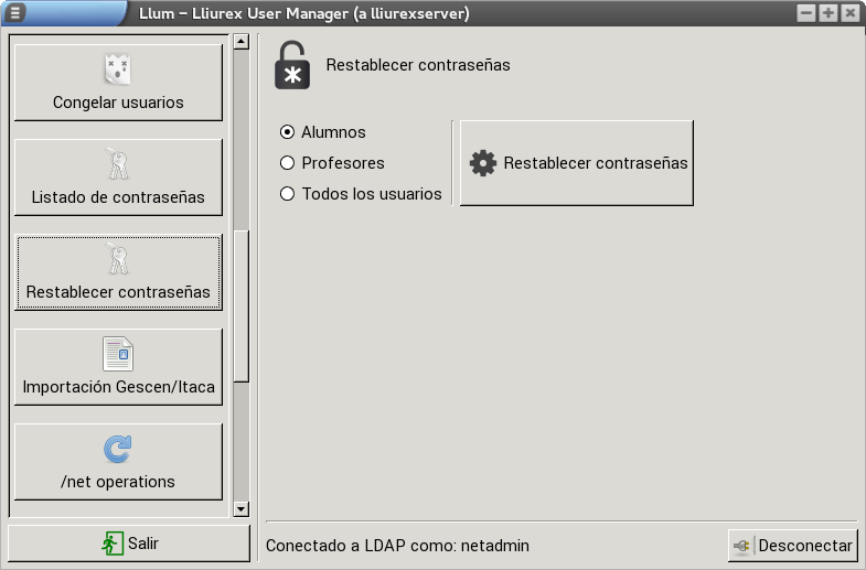 Permite resetear las contraseñas de los grandes grupos de usuarios: Alumnos, profesores, otros.