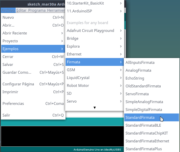 Una vez hayamos iniciado el IDE de Arduino vamos a Archivo > Ejemplos >Firmdata > StandarFirmata