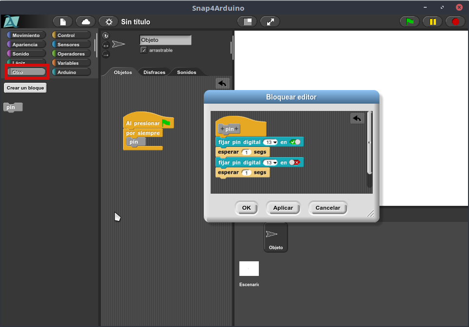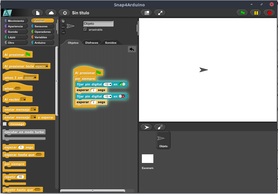 Ahora ya podemos programar nuestro prototipo y cargarlo a la placa Arduino. Ten en cuenta que el programa que creemos en Snap for Arduino no se carga en nuestra placa, sino que envía las órdenes necesarias y el firmata que hemos isntalado las interpreta. Podemos usar el siguiente programa a modo de ejemplo para ver si todo funciona. Recuerda que la mayría de placas de Arduino llevan conectado al pin 13 un led en la placa, el cual veremos parpadear a razón de 1 segundo.