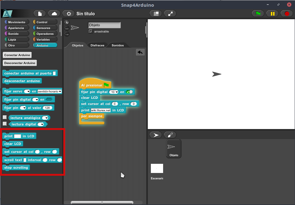 Nos apareceran nuevos bloques que nos permitirán conectar una pantalla LCD 16x2. Podemos usar el siguiente programa a modo prueba.