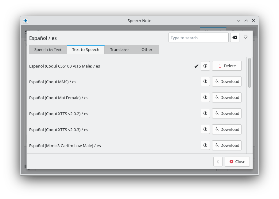 Por defecto, la aplicación no tiene instalado ningún modelo generativo de voz. Pulsa en "Idiomas" en la ventana principal y carga el modelo que te interese: