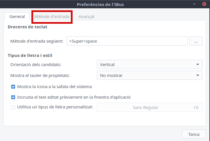 Polsarem sobre la pestanya de mètode d'entrada i veurem totes les tipografies que tenim instal·lades al nostre sistema. Ara li donem a afegir per a que ens apareixquen totes les tipografies disponibles: