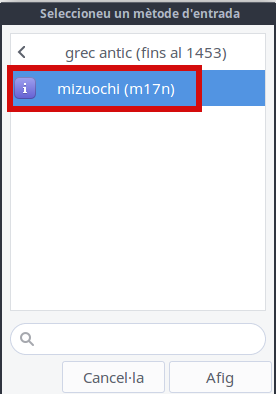 Clickem sobre Grec antic i ens apareixeran les següents opcions. Llavors clickem sobre mozouchi (m17n). i li donem a Afig: