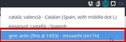 Per a seleccinar quin tipus d'idioma volem hem d'anar a l'àrea de notificacions en la part superior dreta i clickem (botó esquerre del ratolí) sobre les lletres SP. Llavors ens apareixerà un menú amb els idiomes instal·lats i clickem sobre grec antic: