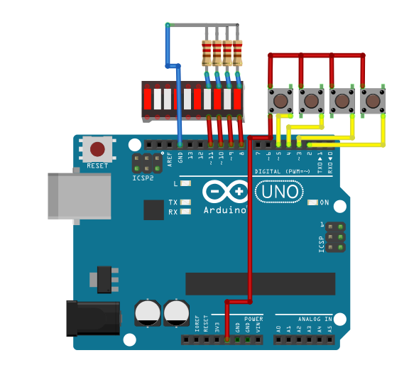 En nuestro caso a modo de ejemplo vamos a crear un programa con 4 pulsadores y 4 leds, dos de los leds los encenderemos con dos pulsadores y los otros dos con dos botones del escenario de trabajo. Los otros dos pulsadores los usaremos para mover el muñeco hacia delante y girar.