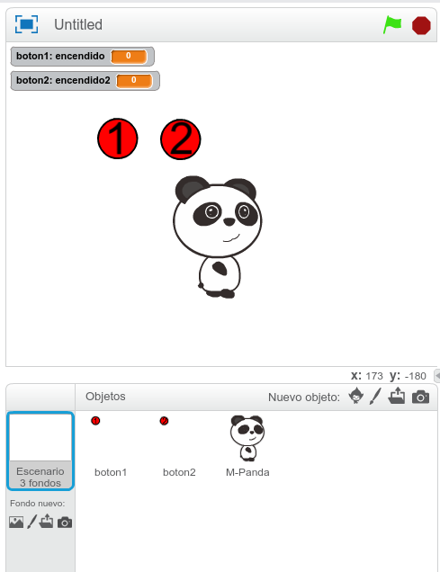 Para crear el programa accederiamos a los diferentes objectos que compoenen nuestro programa. En este caso hemos creado dos botones (botón1 y botón2) y M-Panda. Para acceder a cada uno de los obejtos, hemos de hacer doble click sobre ellos. Cada objeto tiene propio código que se activa cuando se interactúa con el objeto a través de eventos y puede modificar sus propiedades.