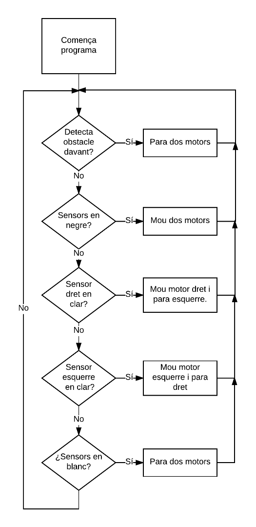 • El robot seguirà una línia negra i quan se n'isca tornarà altra vegada a la línia.